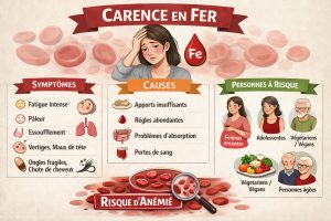 À retenirLa carence en fer est fréquente, souvent silencieuse et pourtant évitable dans de nombreux cas. Une approche globale, combinant alimentation adaptée, dépistage ciblé et prise en charge personnalisée, permet d’en limiter les conséquences.