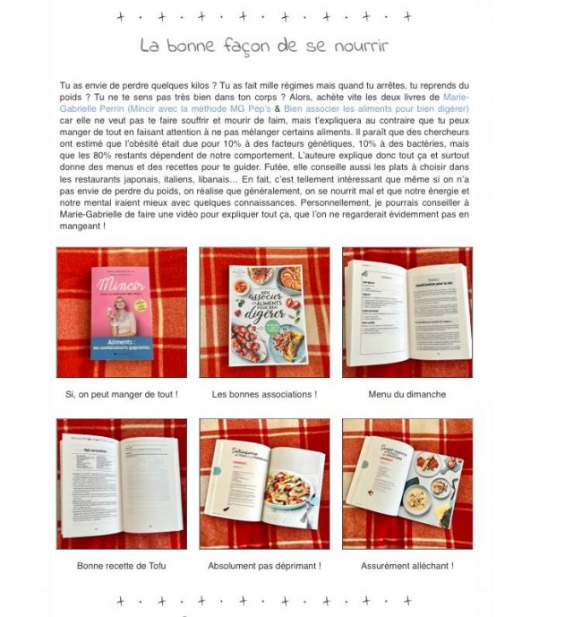 Santé Magazine : Comment maigrir en mangeant de tout Perdre du poids, c’est facile ! À condition de choisir les bonnes combinaisons alimentaires qui respectent les mécanismes de la digestion. C’est ce que propose Marie-Gabrielle Perrin, avec sa méthode MG Pep’s, un programme de rééquilibrage alimentaire. Voir l’article Santé Magazine